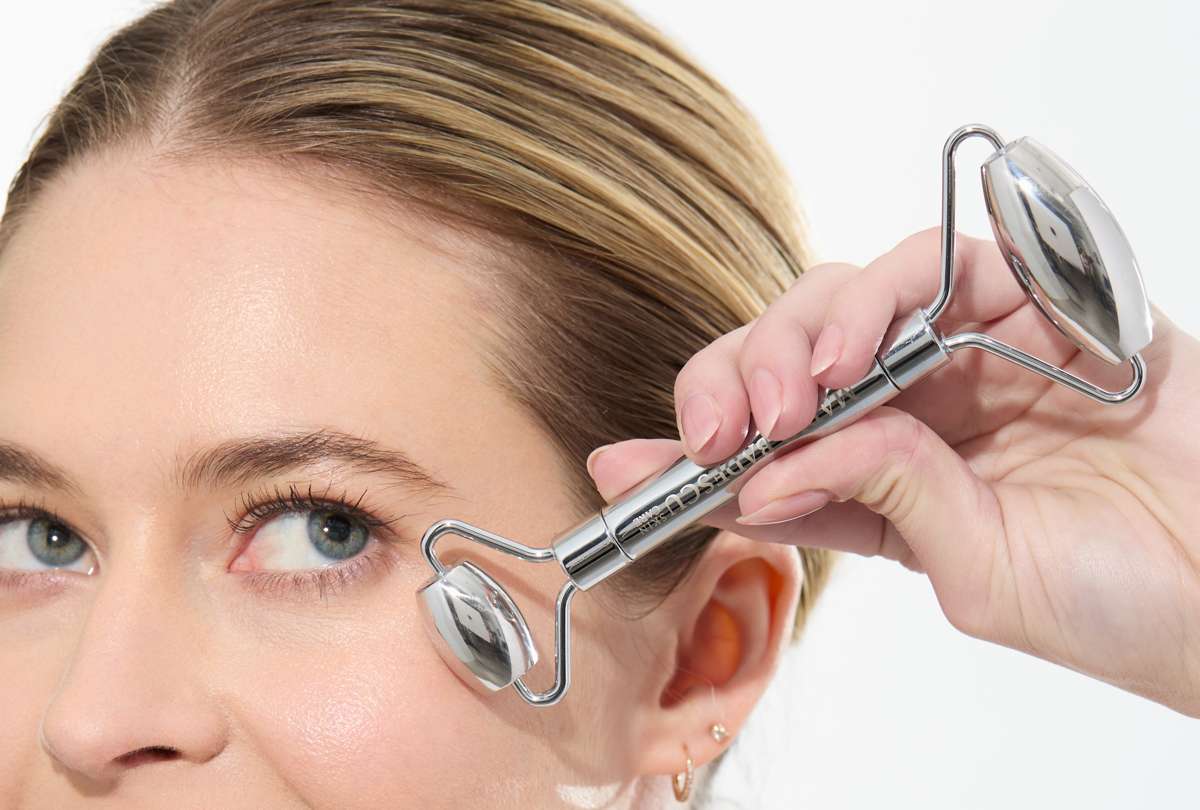 Roll in an upward and outward motion. Use the larger roller for cheeks, forehead, and neck. Use the smaller roller for under the eyes and around the nose.