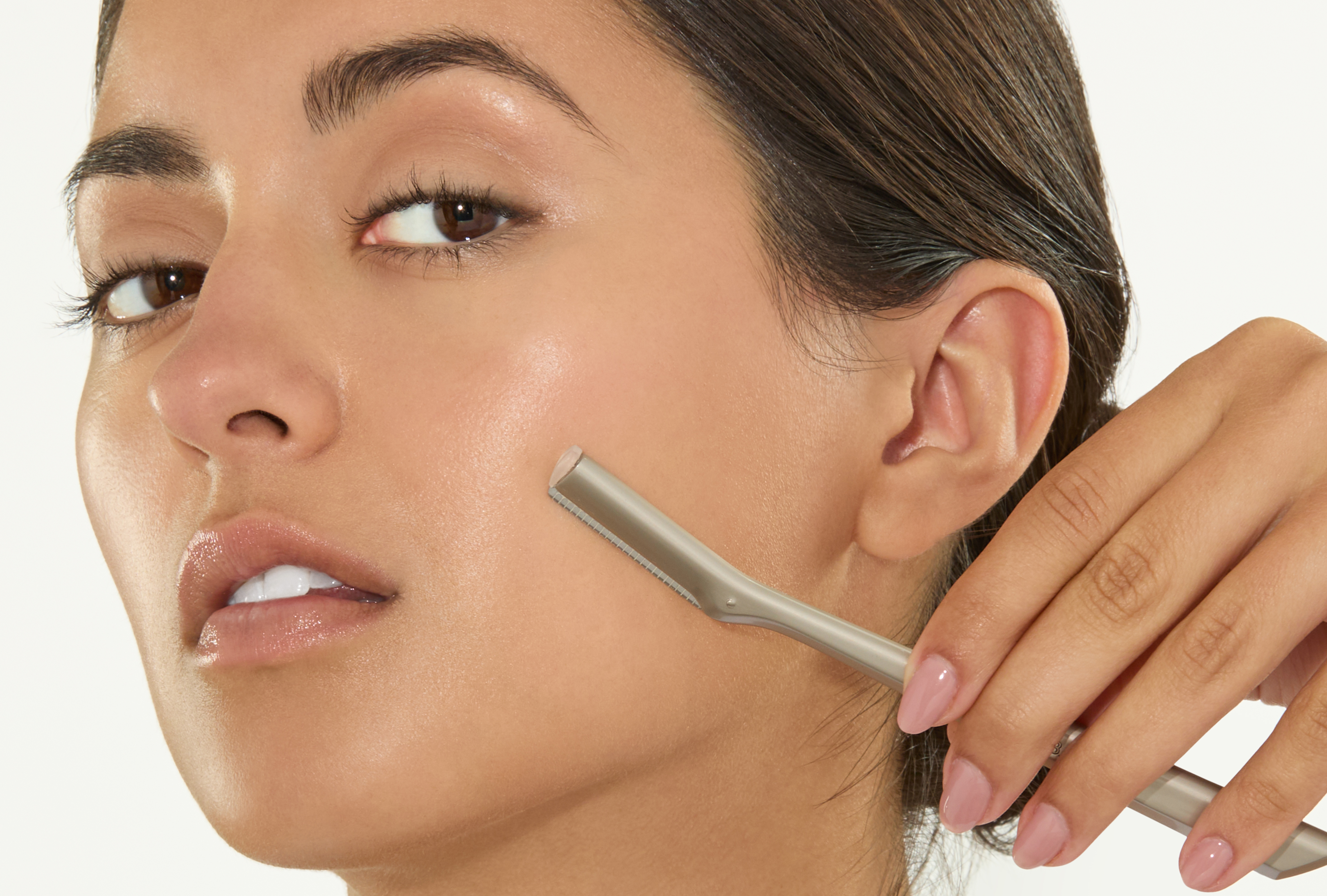 For a smooth glide, dermaplane during cleansing—leave your face wash on as slip—or prep dry skin with a few drops of serum before use