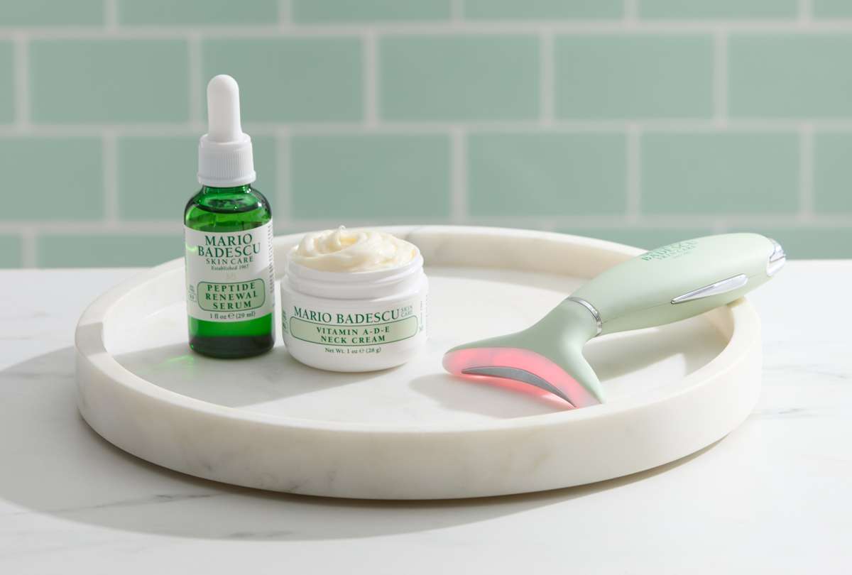 Massage and Sculpt: Glide the device in an upward motion with gentle strokes, repeating each stroke 6-10 times per area. Follow up the treatment by applying Mario Badescu’s Vitamin A-D-E Neck Cream to the neck and décolletage.